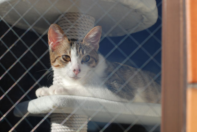 転居初日にしてキャットタワー最上段を制覇し、外の眺めの良さを覚えた様子。
