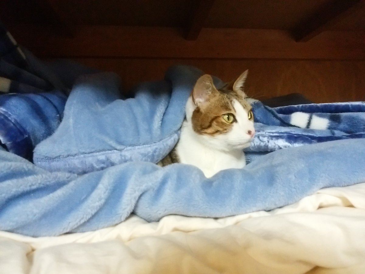実家から帰宅した時のナナ。タイマー給餌器で18時に夕食を済ませて、毛布にくるまってぬくぬくしていた。現状ならこうするのが一番寒くない、というのをわかっててやってるあたりはさすがである。