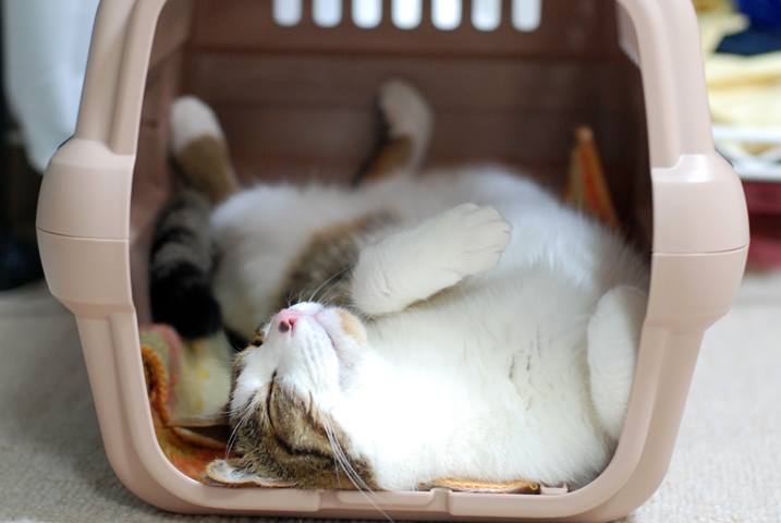 一回目を覚まして外に出てきて伸びをしたものの、すぐにキャリーの奥に入っていって、いまはまたこんな感じ。