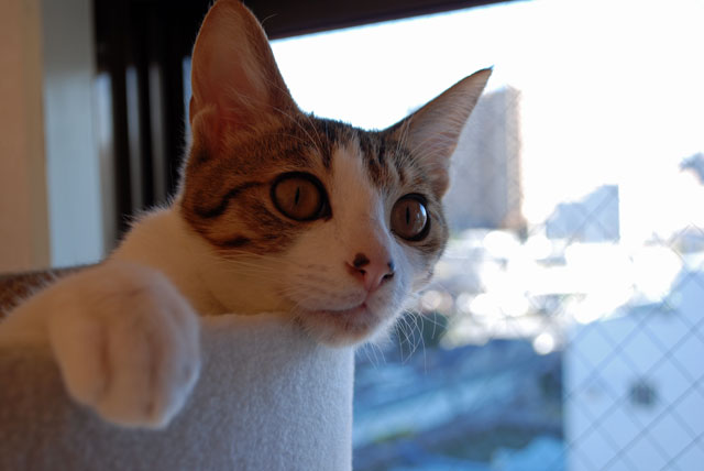 キャットタワーから外の景色を眺めるのがお気に入りの様子。